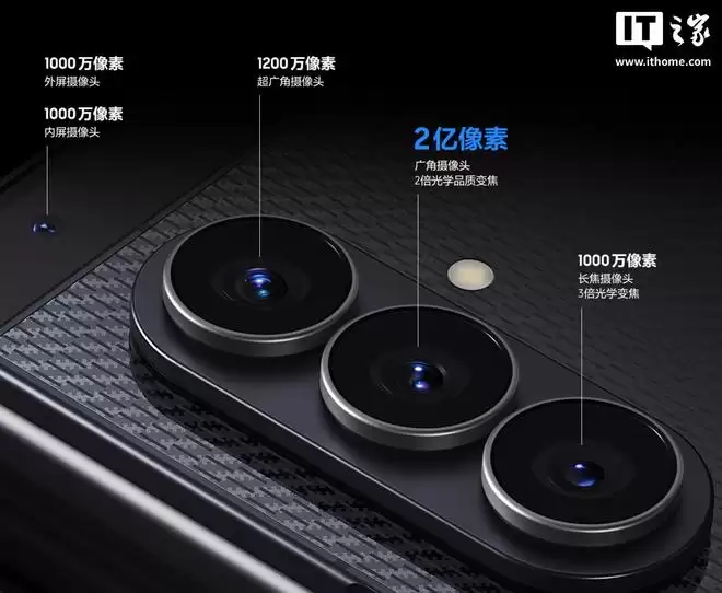 影像方面,Galaxy Z TriFold配备了2亿像素的主摄像头,可实现2倍光学品质变焦。辅以1200万像素的超广角镜头和1000万像素的3倍光学变焦长焦镜头。其外屏和内屏的前置摄像头均为1000万像素。