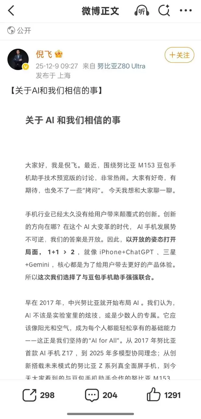 12 月 9 日消息,中兴通讯终端事业部总裁、努比亚技术有限公司总裁倪飞今日发布长文,谈及了努比亚 M153 豆包手机助手技术预览版。他表示,手机行业已经太久没给用户带来颠覆式的创新,AI 手机发
