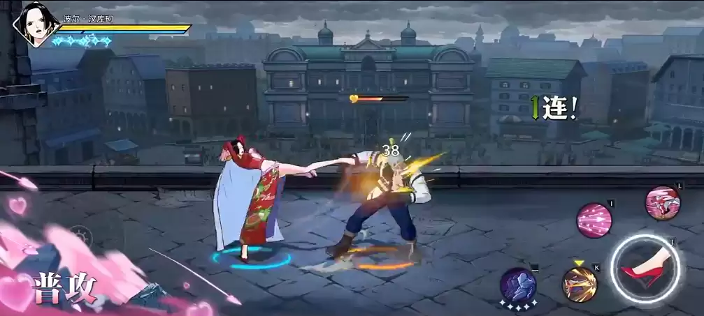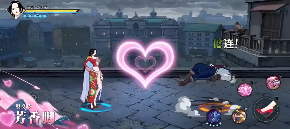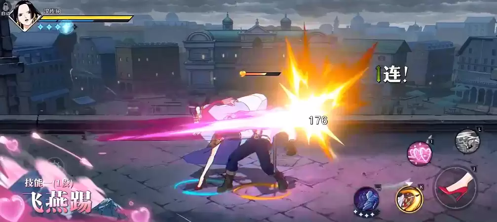 一技能“飞燕踢”支持点按与长按两种释放模式。点按时分为三段:首段为直线飞踹,二段为斜上方旋转踢击,三段为空中高弹腿下劈,具备抓取判定;长按则会激活果实能力融合机制,消耗额外精力值,全面提升各段攻击性能。