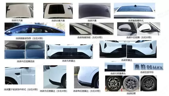 根据申报信息,新款海豹06 EV将提供无天窗版、全景天窗版以及可开启全景天幕版可选。车窗四周可以选装黑色装饰条,前侧包围也支持不同风格的选择,同时提供了多种样式的轮毂供消费者搭配。