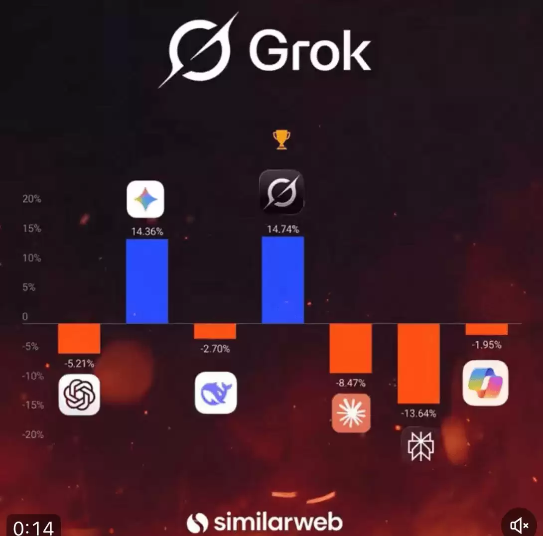 12月10日,根据数字智能平台Similarweb最新发布的数据,马斯克旗下人工智能公司xAI推出的聊天机器人Grok在11月份实现了惊人的月流量增长,一举创下新高,甚至超越了ChatGPT、Gemini、Claude、Perplexity以及Copilot等竞争对手。