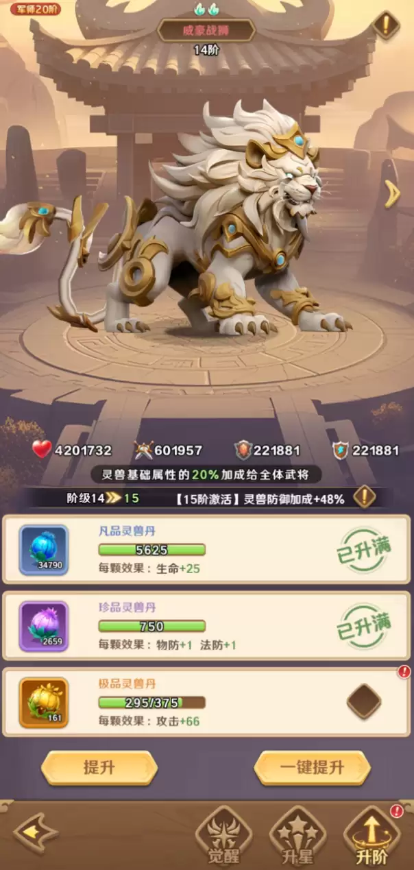 豪威战狮:前期玩家完全可以考虑这只灵兽,它定位为全能型的输出角色。在战斗中,它能直击敌方核心的弱点,施展技能后,还能为全体武将提供怒气值的加成。同时,它也能有效提升队伍的整体伤害、暴击率以及爆伤等属性。它的加入,往往能让整个队伍的战斗力显著增强。对于玩家来说,在资源分配上,可以直接将豪威战狮提升至6星,从而解锁其被动技能,再进行合理运用即可。