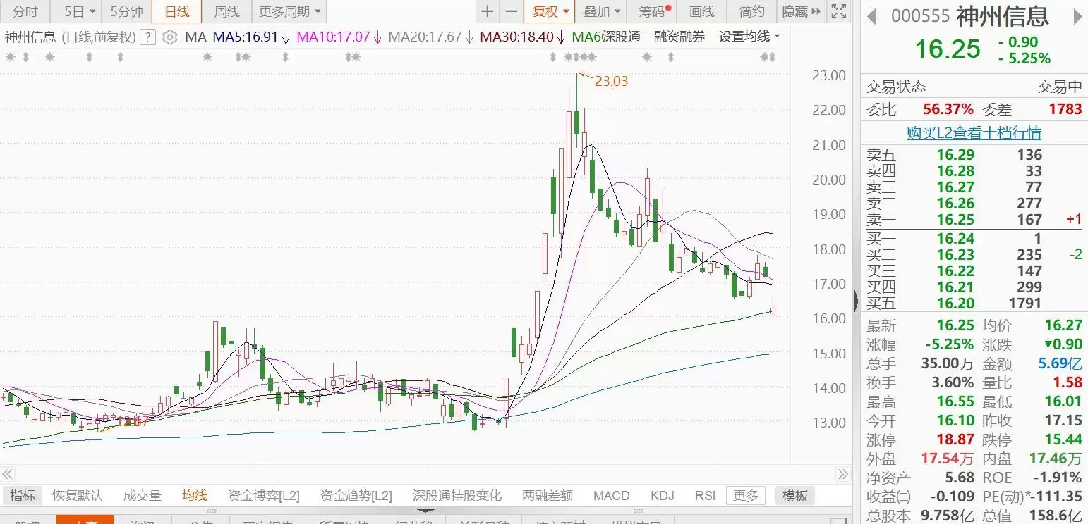 神州信息(000555 SZ)今日跳空低开,现跌5 25%报16 25元,股价创逾一个月新低,总市值158 6亿元。神州信息公告称,公司控股股东神州数码软件有限公司计划在2025年12月31日至20