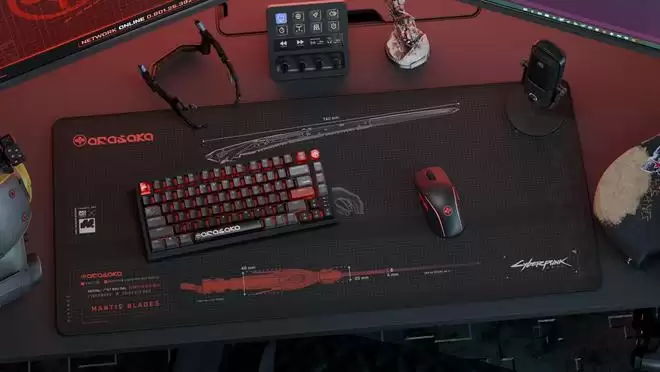 该鼠标垫尺寸宽大,足以覆盖常规的电竞桌面。垫面印有荒坂集团标志性产品“螳螂刀义体”的结构图,将游戏世界的美术设计原汁原味地呈现在玩家的桌面上,营造出浓厚的赛博朋克氛围。