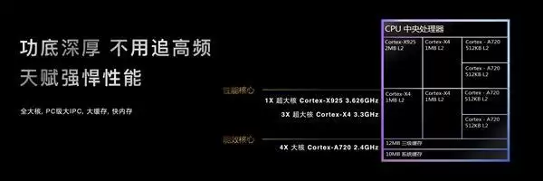 天玑9400采用台积电第二代3nm制程工艺,晶体管密度较上一代提升20%,集成PC级Arm v9架构,打造“1×3.62GHz Cortex-X925超大核+3×Cortex-X4大核+4×Cortex-A720大核”的全大核CPU配置——无小核拖曳性能的短板,单核性能较上一代提升35%,多任务切换无卡顿;多核性能提升28%,轻松应对AI修图、4K视频剪辑等重负载任务。