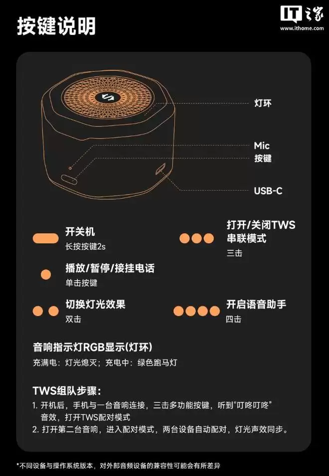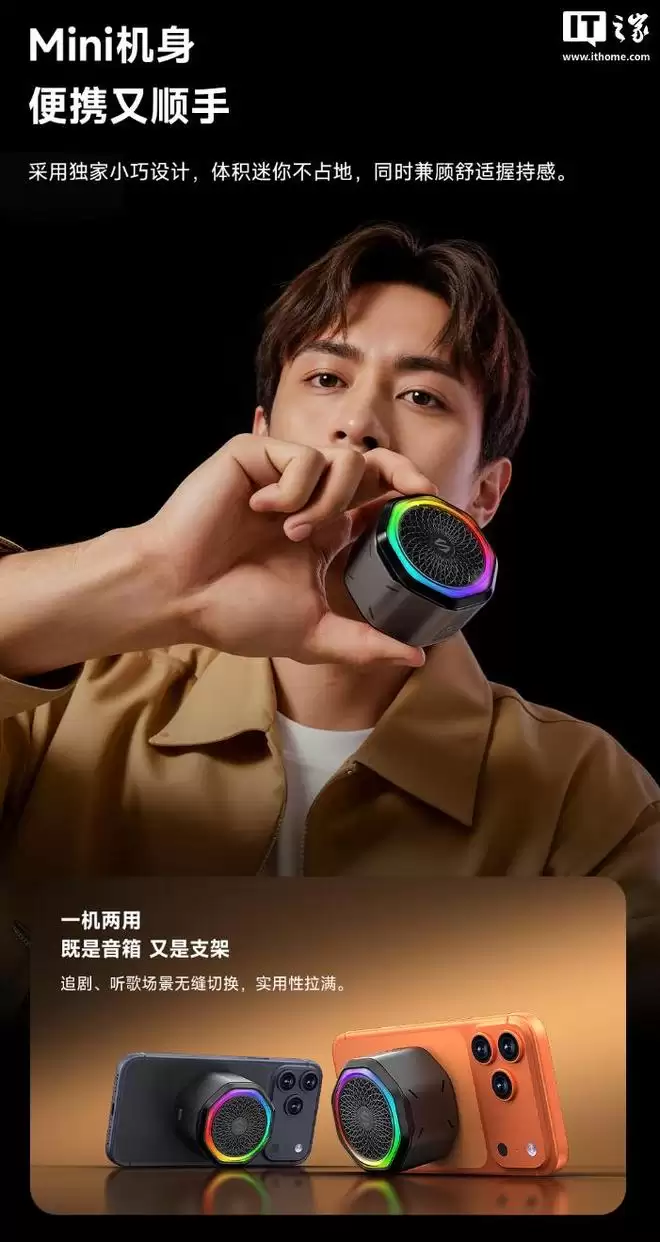 该音箱的底部拥有 N52 级强力磁铁,可直接吸附在苹果 iPhone 等自带磁吸的手机,机身采用迷你设计,横放时还可以作为手机支架使用,配备 750mAh 电池,满电状态下可连续使用 16 小时,机身顶部拥有经典的 RGB 灯效,可提升聚会等场景的氛围。