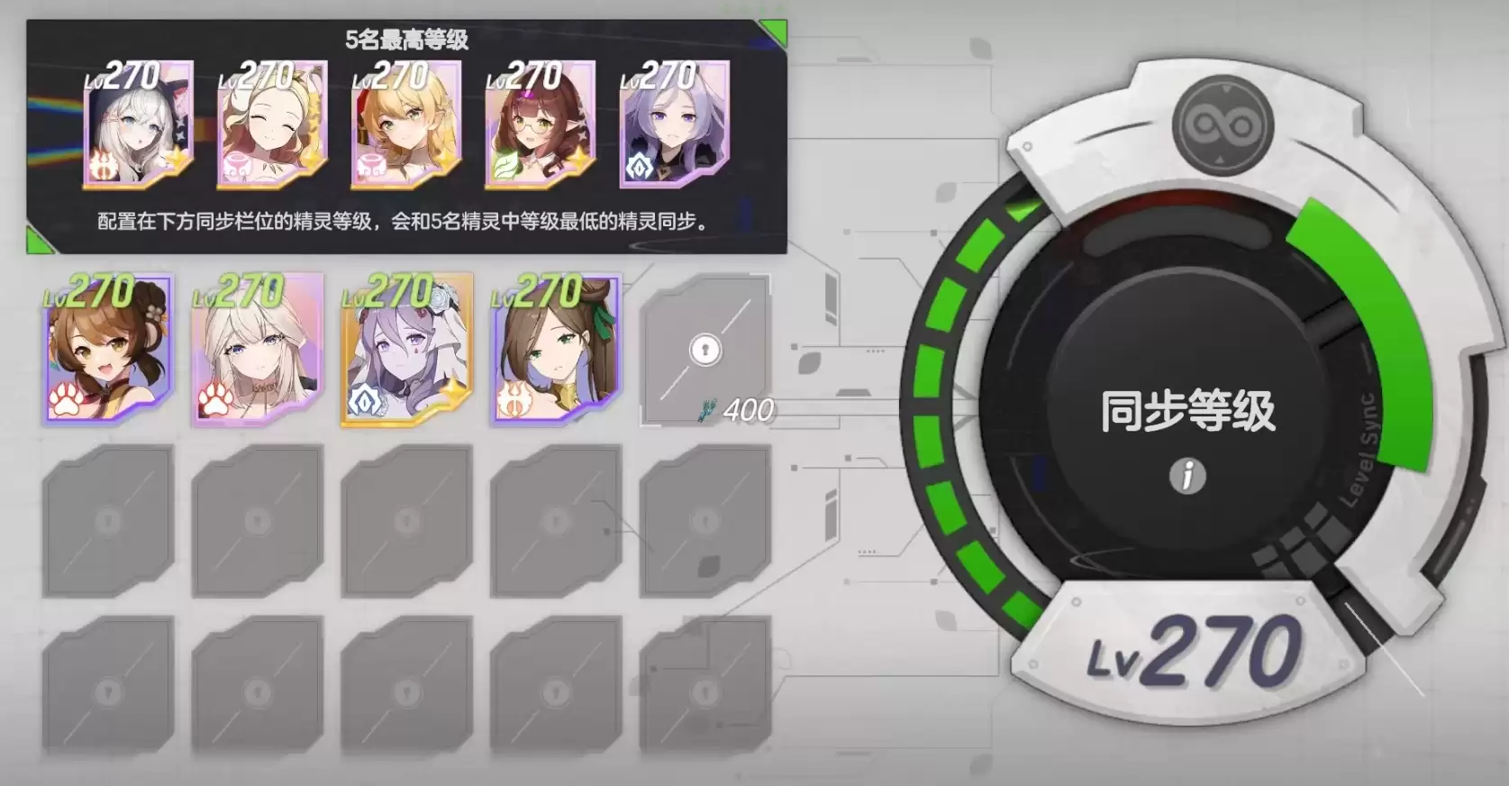 召唤券能让玩家从卡池中抽取到多位风格各异的精灵少女。她们都可以通过养成来提升战力。游戏还贴心地开放了“同步等级”功能,玩家只需放置五名等级最高的精灵少女,再将需要升级的精灵放入同步栏位,游戏便会立刻让她的等级与这五名放置的精灵同步。但需要注意,同步时能提升的最高等级,将以五名放置精灵中等级最低的那位为基准。因此,最好让这五名精灵少女都保持相同的等级。