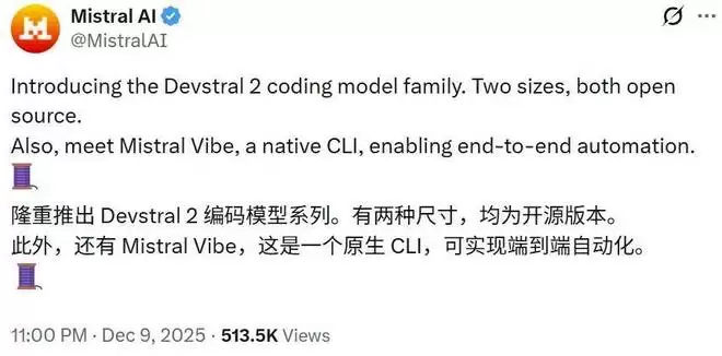 Mistral AI 的进击速度令人咋舌。仅仅一周前,他们才发布 Mistral 3 系列模型,被视为欧洲正式以此跻身 AI 前沿竞争的序幕。仅仅过了 7 天,Devstral 2 系列与 Mistral Vibe 便紧随其后问世,这种高频的发布节奏,似乎正在印证人们对欧洲 AI 崛起的判断。