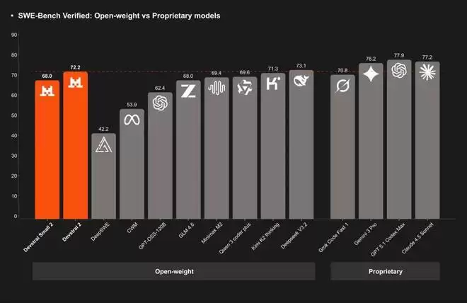 体量更轻的 Devstral Small 2 在 SWE-bench Verified 上得分为 68.0%,能与大其五倍的模型比肩,同时还具备在消费级硬件上本地运行的独特优势。