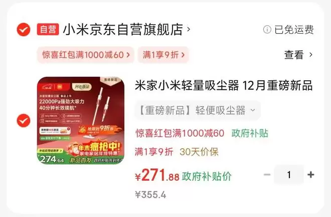 米家轻量吸尘器,定价 359 元,叠加国补和平台优惠后,目前京东自营低至 271 元。
