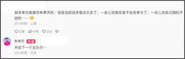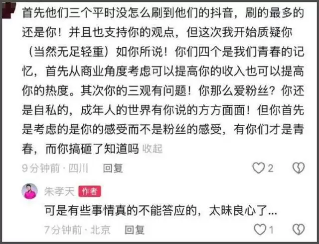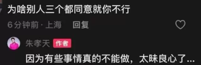 还有网友质问,为什么其他三个人都能答应,就他不行?朱孝天依旧回应称“因为有些事情真的不能做,太昧良心”,就差把和3观念不合摆在明面上了,还阴阳其他三人“昧良心”。