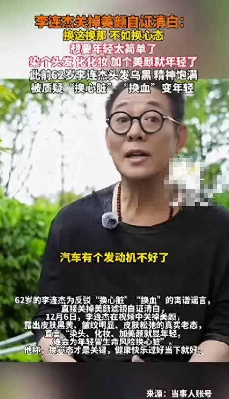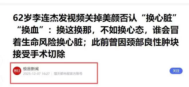 极目新闻2025-12-7《62岁李连杰发视频关掉美颜否认“换心脏”“换血”:换这换那,不如换心态,谁会冒着生命风险换心脏;此前曾因颈部良性肿块接受手术切除》
