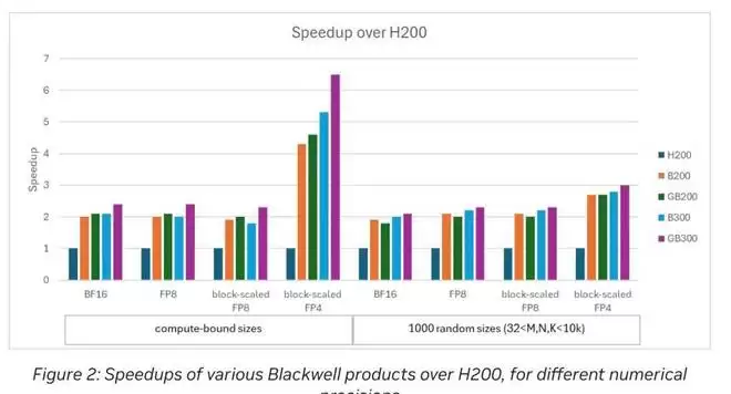 CUDA Toolkit 12.9 在 NVIDIA Blackwell 平台上引入了块缩放的 FP4 和 FP8 矩阵乘法。CUDA 13.1 增加了对这些数据类型和 BF16 的性能支持。图 2 显示了在 NVIDIA Blackwell 和 Hopper 平台上的加速比。