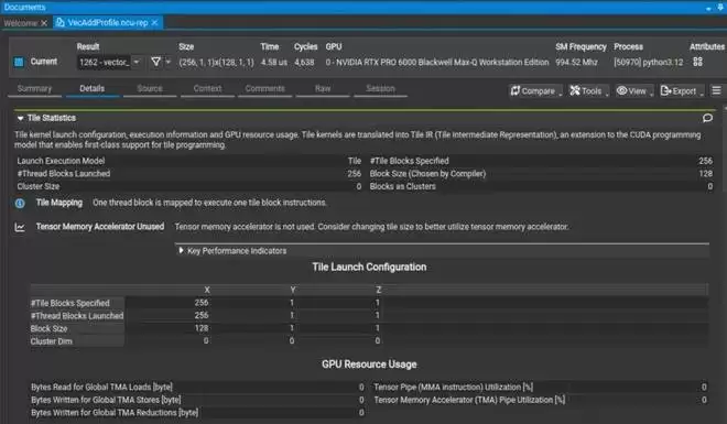 在摘要页新增「Result Type」(结果类型)列,用于区分 Tile 核函数与 SIMT 核函数。详情页新增「Tile Statistics」(Tile 统计)部分,总结 Tile 维度和重要管线(pipeline)的利用率。源码页支持将指标映射到高层级的 cuTile 核函数源码。