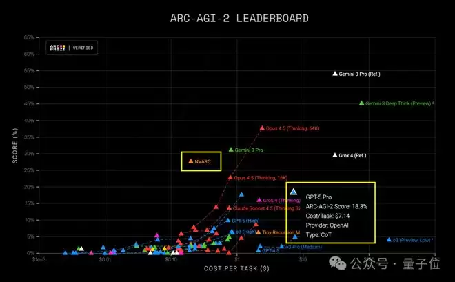ARC-AGI 2最新成绩,4B小模型NVARC27.64%的公开榜成绩力压GPT-5 Pro 18.3%登顶榜首。