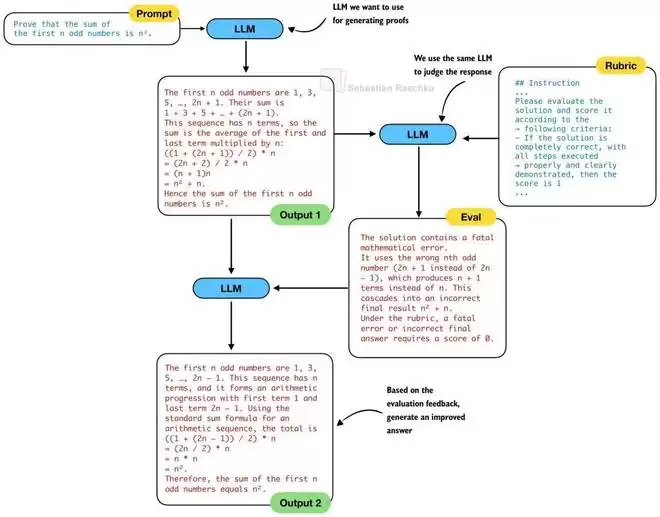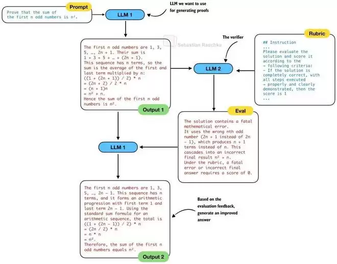 传统上,在自我修正这种成熟且流行的推理扩展技术中,我们会使用同一个 LLM 来生成解决方案并对其进行验证,然后再进行修正。换句话说,在前面的图 12 和 13 中,LLM 1 和 LLM 2 将是同一个 LLM。因此,传统的自我修正过程如下所示: