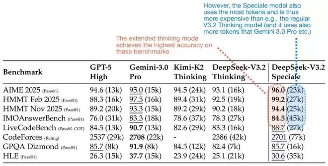 图 1:DeepSeek V3.2 与专有旗舰模型之间的基准测试对比。来自 DeepSeek V3.2 报告 并加上了注释。