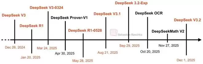 图 3:自去年以来的 DeepSeek 发布情况。主要模型以红色显示。