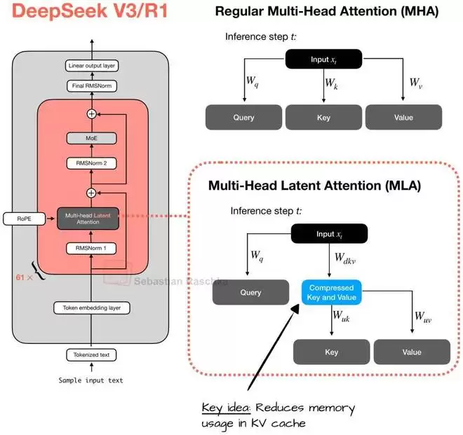 顺便说一句,正如前面提到的,MLA 在 DeepSeek V3 中并不是新事物,因为它的前身 DeepSeek V2 也使用了(甚至引入了)它。