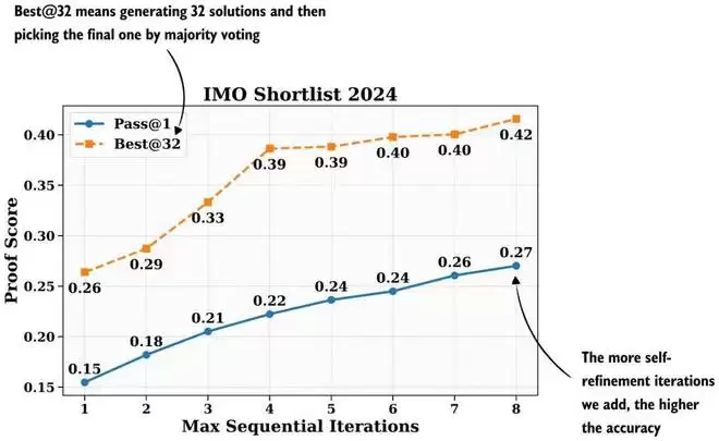 图 16:额外的自我修正迭代提高了准确性。来自 DeepSeekMath V2 论文,并加上了注释。Best@32 多数投票方法也被称为自我一致性(Self-consistency)。