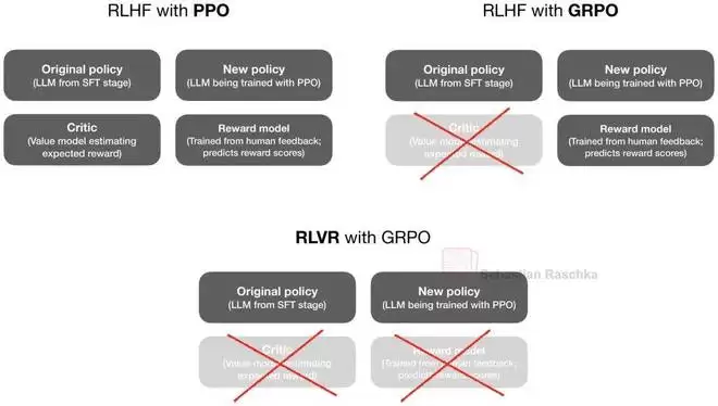 图 8:LLM 训练中强化学习设置的比较。传统的带 PPO 的 RLHF 使用奖励模型(基于人类偏好训练)和评论家(价值模型)来指导学习。GRPO 取消了评论家模型。带 GRPO 的 RLVR 更进一步,移除了奖励模型,转而依赖来自符号工具(如计算器或编译器)的可验证奖励。