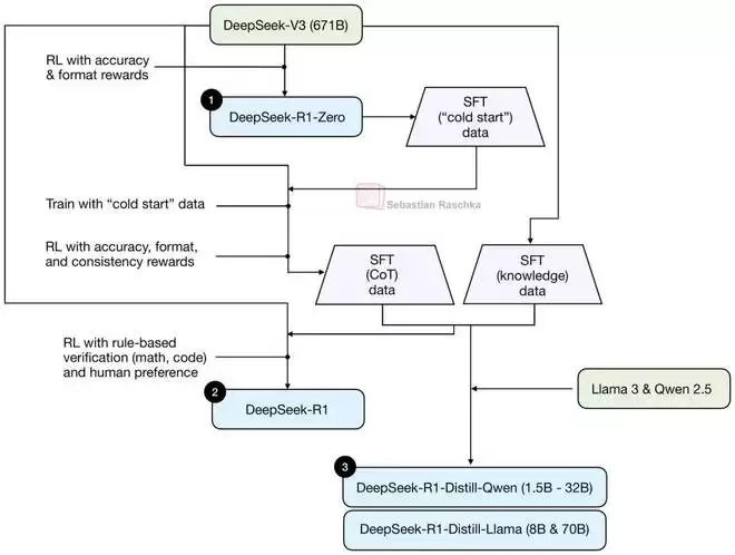 在进一步讨论模型细节之前,有必要先探讨一下整体的模型类型。最初,DeepSeek V3 是作为一个基础模型发布的,而 DeepSeek R1 则增加了额外的后训练,以开发成一个专用的推理模型。这一过程总结在下图中。