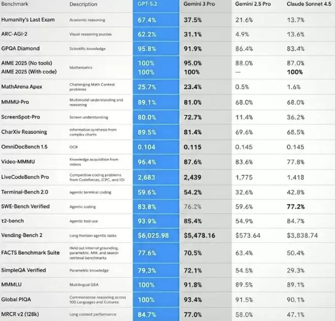 图片显示,GPT-5.2的基准测试分数几乎全面超越Gemini 3 Pro。