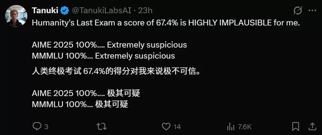网友Tanuki指出,人类最后的考试67.4%的得分极不可信。