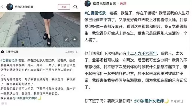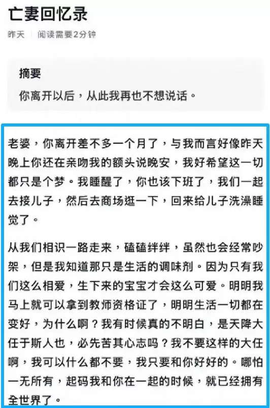 他的妻子因为车祸离世后,他一直在网上发各种深情文案,最近受到了全网的关注。