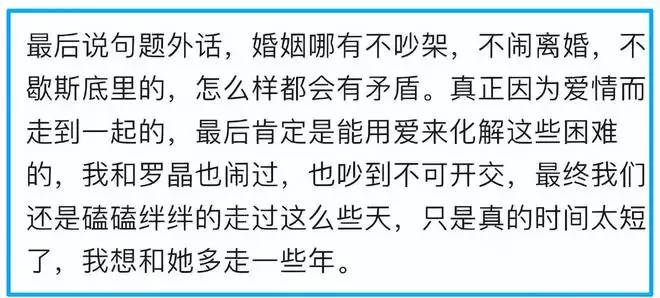 小作文的最后,邓钧说,婚姻哪有不吵架,不闹离婚,不歇斯底里的,怎么样都会闹矛盾。但只要有爱,最后都会化解。
