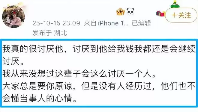 到了25年10月,罗晶甚至在网上发布了“我真的讨厌他,讨厌到他给我钱我都会继续讨厌”。