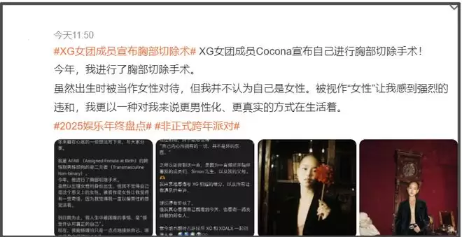 ——最近由7位日籍成员组成的女团XG意外受到关注,原因在于XG团内年龄最小的成员COCONA(秋山心响)自曝接受了胸部切除手术,她表示自己是AFAB的Transmasculine Non-binary,在家人、成员、公司的支持下去除了自己的女性特征。