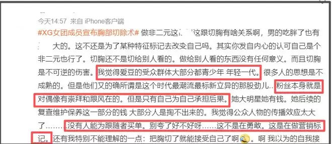 XG虽然称不上大红大紫,但还是有粉丝的,在COCONA本人都认知混乱的情况下,XG组合制作人和公司都站出来表示支持,大肆炒作宣传,很容易对未成年粉丝产生负面引导。