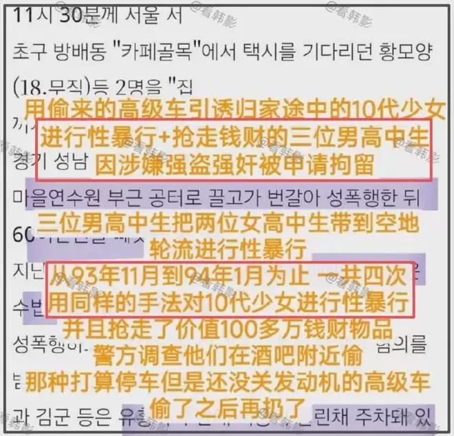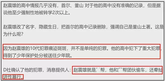 韩媒扒出赵震雄高二的时候就曾因涉嫌盗窃强奸而被判刑,随后韩网也扒出当年的相关报道。据悉,赵震雄在高中时期用偷来的高级车引诱女生并实施犯罪行为,3个月内犯下四起抢劫强奸案,行为非常恶劣。