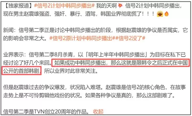 而韩媒还在试探,报道称由赵震雄主演的《信号2》正计划打破限韩令,在中韩同步公开上映,赵震雄的塌房让业内很是慌张。