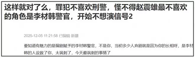 而赵震雄本人还曾直言最不喜欢这个角色,认为本来就可以简单带过的事情,“非要自找麻烦”,如今网友也明白了,“一个罪犯无论如何也是不可能共情警察的”,他能演好这个角色才怪了。