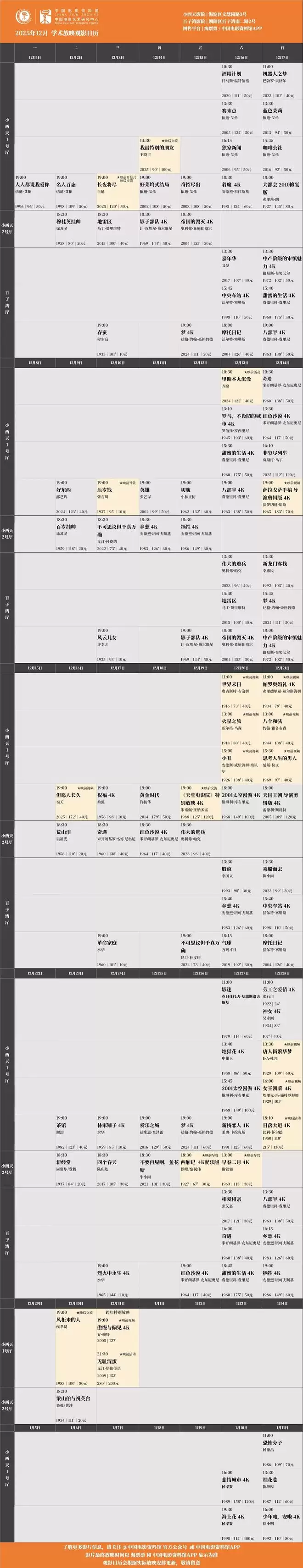 所有场次均可在淘票票、中国电影资料馆APP购票,具体排片见末图,祝大家观影愉快。❤️