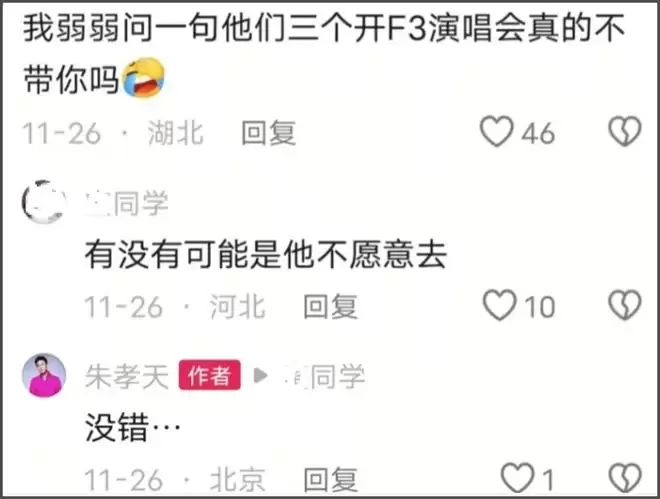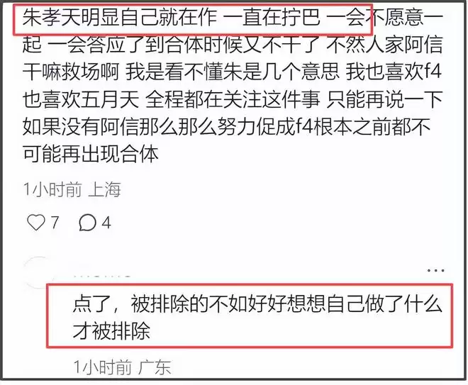 有网友质疑朱孝天受队内排挤,因为回应粉丝就被踢出局,也太冤枉了,是真心想办合体演唱会吗?