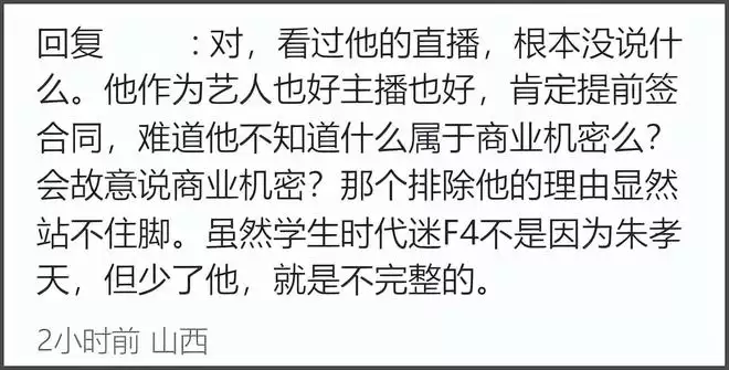也有网友指责朱孝天没有团魂,合体后还在直播中强调和其他三人不熟,打破网友滤镜。一边期待合体,一边又说和队友不熟,被踢出局之后又说是自己不想去,实在太拧巴了。