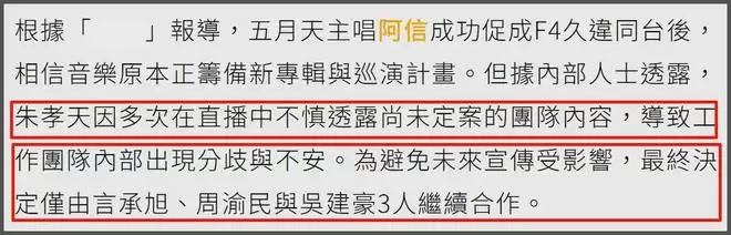 据台媒报道,朱孝天因为泄密被除名,不少网友对此都表示不满,朱孝天并没有在直播中爆料细节,只是说F4演唱会在筹备中了,到时候会有新歌,这个程度也算泄密?