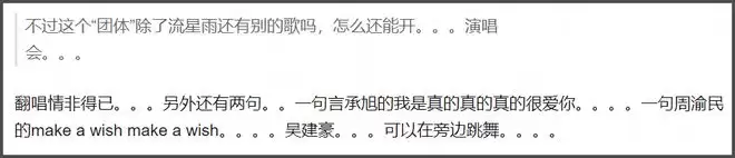 还有一部分网友直接质疑F3有没有实力办演唱会,回忆F4的音乐作品,除了《流星花园》的主题曲之外,似乎也没什么团体歌曲了。