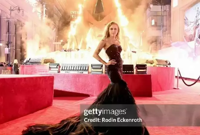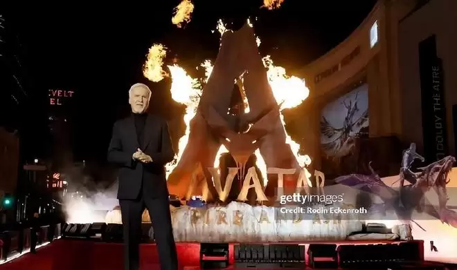 这样的猜测还是比较靠谱的,我们看下12月1日《阿凡达3》在洛杉矶举办的首映礼,最核心的环节就是火,尤其是走红毯时,导演主演都在燃烧着熊熊大火的电影宣传场景前留了影,并且制作成了海报。