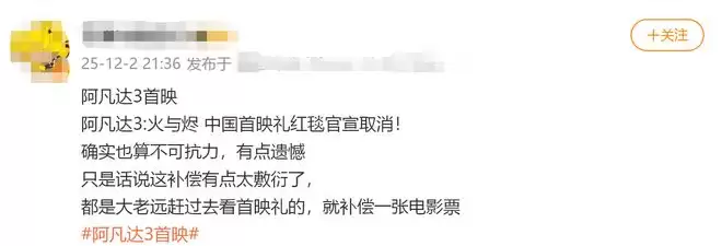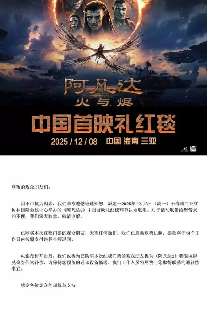 可惜12月1日三亚还在宣传电影首映礼,结果12月2日就传出《阿凡达3》内地首映礼红毯取消的消息,给出的理由也很模糊,声称是因为“不可抗力”。