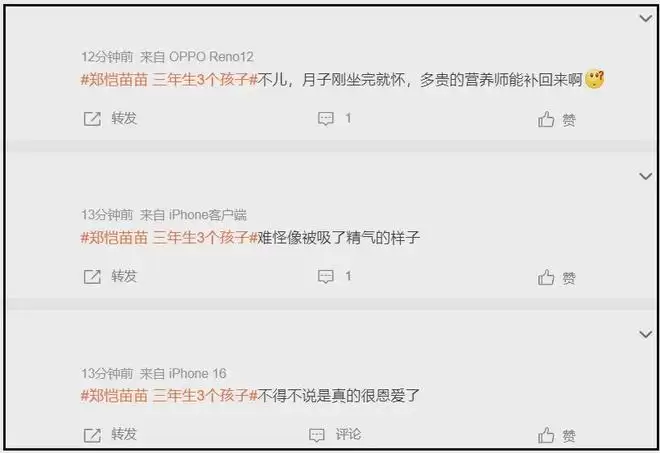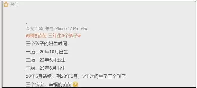 实际上,网友也不是因为爆料才质疑郑恺和苗苗的,之所以吐槽郑恺的爱妻人设,更多还是因为苗苗三年生了三胎。
