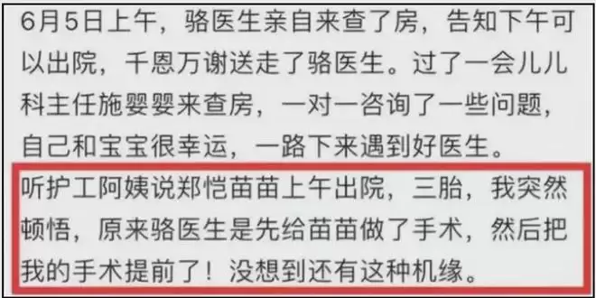 倒是有一条爆料可以互相验证,就是有人提到苗苗三胎早产臀位开刀,和孕妇口中的“骆医生先给苗苗做手术”的说法对上了。