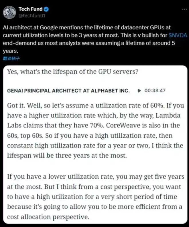 AI芯片的生命周期更多时候不是由物理损耗决定,而是由技术迭代决定。谷歌TPU创始人之一、现Groq公司CEO Jonathan Ross的观点更为激进。他表示,Groq正采用1年期的芯片摊销,并直言那些采用3到5年摊销期的人“完全错了”。