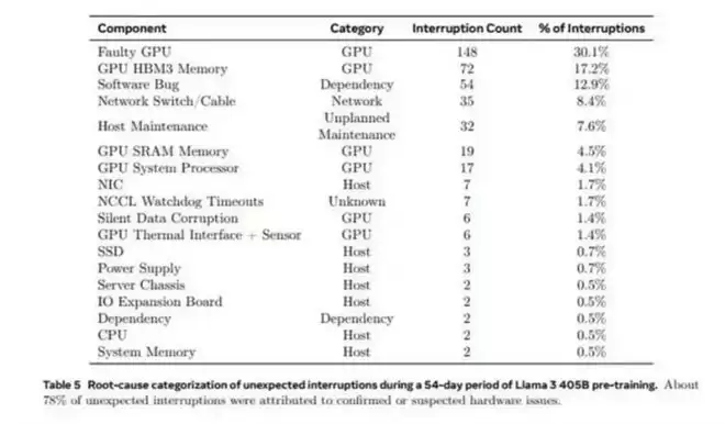 这一观点得到了Meta公司研究数据的侧面印证。Meta在描述其使用Nvidia H100 GPU训练Llama 3模型时披露,即便在仅约38%的利用率下,由GPU故障(包括NVLink)和HBM3高带宽内存故障(HBM通常集成在GPU上)导致的训练中断,合计占总故障的47.3%。有分析推论,若将利用率提升至行业常见的60%-70%,其故障率可能显著增加。这表明,在AI训练中最重要的组件,GPU,同时也是最“脆弱”的。高强度的训练会导致频繁的硬件不稳定和维护需求,大幅增加了运维成本,降低了资产的有效产出率。