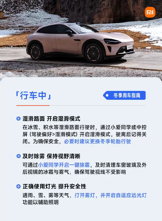 12月10日,小米汽车发布了一份冬季用车实用指南。内容指出,出发前应检查胎压情况,官方推荐的胎压值为2.9bar;同时应避免车辆在低电量状态下长期停放在室外。在清洗车辆时,要避免使用热水,以防车漆和玻璃因热胀冷缩而受损。建议不要直接用雨刮器清理玻璃上的积雪,以免造成损坏。正确的操作步骤是:先清扫表面积雪 – 通过中控屏开启“雨刮器维护模式” – 轻抬雨刮臂清除残留冰渣 – 最后使用前风挡除雾功能融化残余冰层。