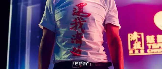 这句煽情的话刚说完,高台后方就坠下了一双人腿,镜头往上移动,那是一个吊着的死人,简单的白T恤上,印着鲜红的“还我清白”四个大字。