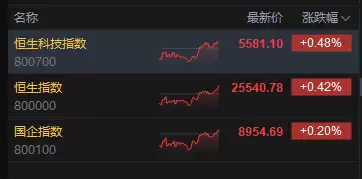 12月10日消息,港股三大指数集体上涨。截至收盘,恒生指数涨0 42%,报25540 78点,恒生科技指数涨0 48%,国企指数涨0 20%。盘面上,科网股涨多跌少,美团涨超2%,百度、阿里巴巴、小